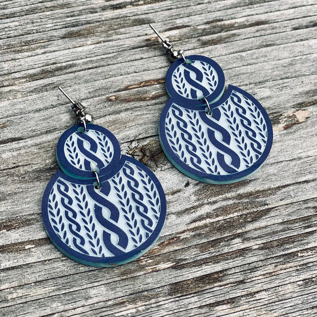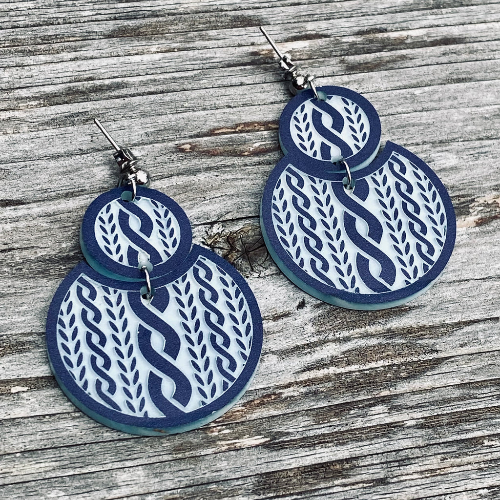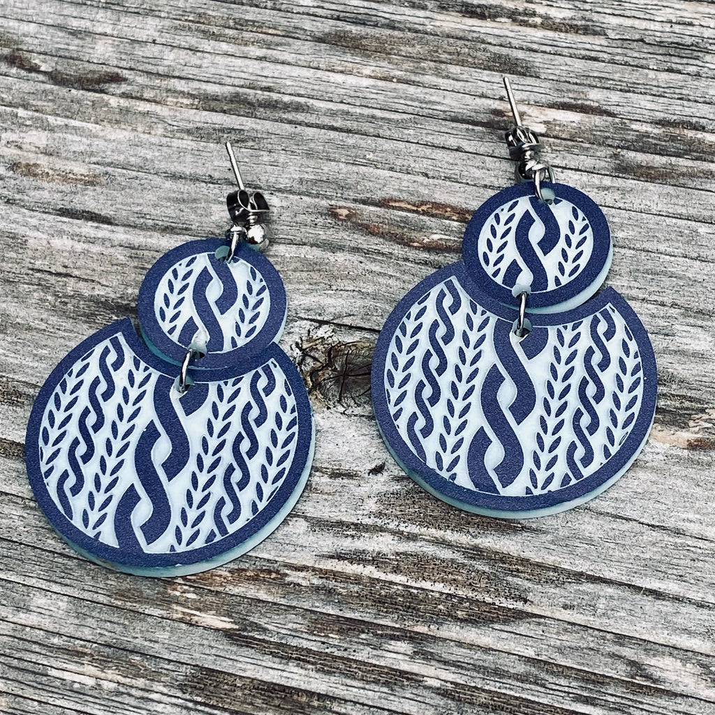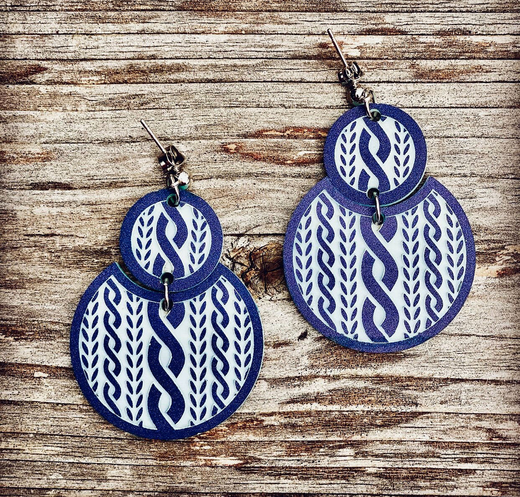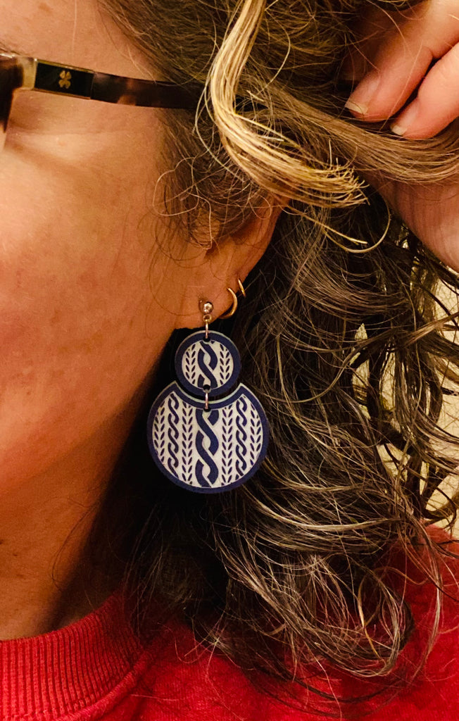 It’s sweater weather, and Heather is ready for it. Created from navy and white core acrylic. Finished with nickel free silver hardware posts.